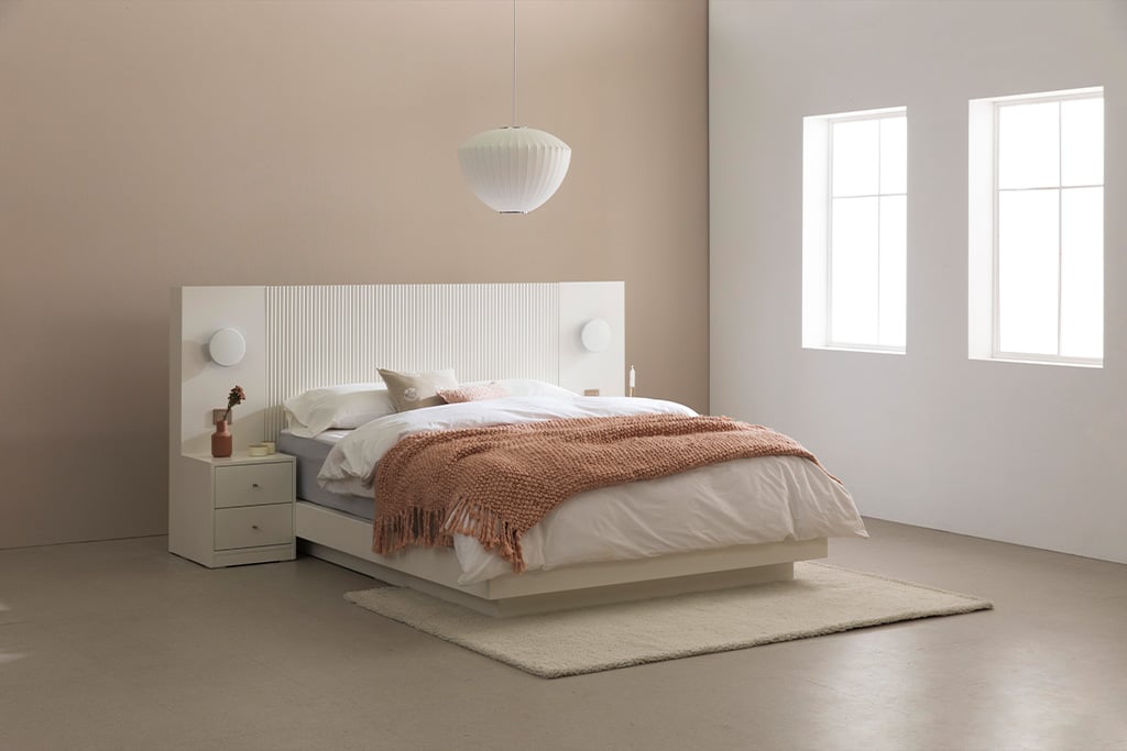 Khung giường Sage được làm từ gỗ MDF cao cấp, phủ lớp sơn bền màu đạt tiêu chuẩn Hàn Quốc, giúp bề mặt nhẵn mịn và dễ vệ sinh. Đầu giường được thiết kế liền khối với tủ nhỏ hai bên, vừa mang lại cảm giác gọn gàng, vừa giúp tối ưu diện tích phòng ngủ.