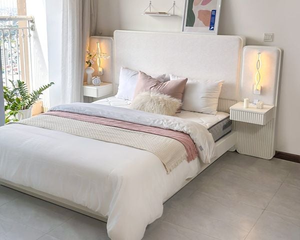 Giường Champagne với màu trắng kem rất phù hợp với phong cách tối giản.