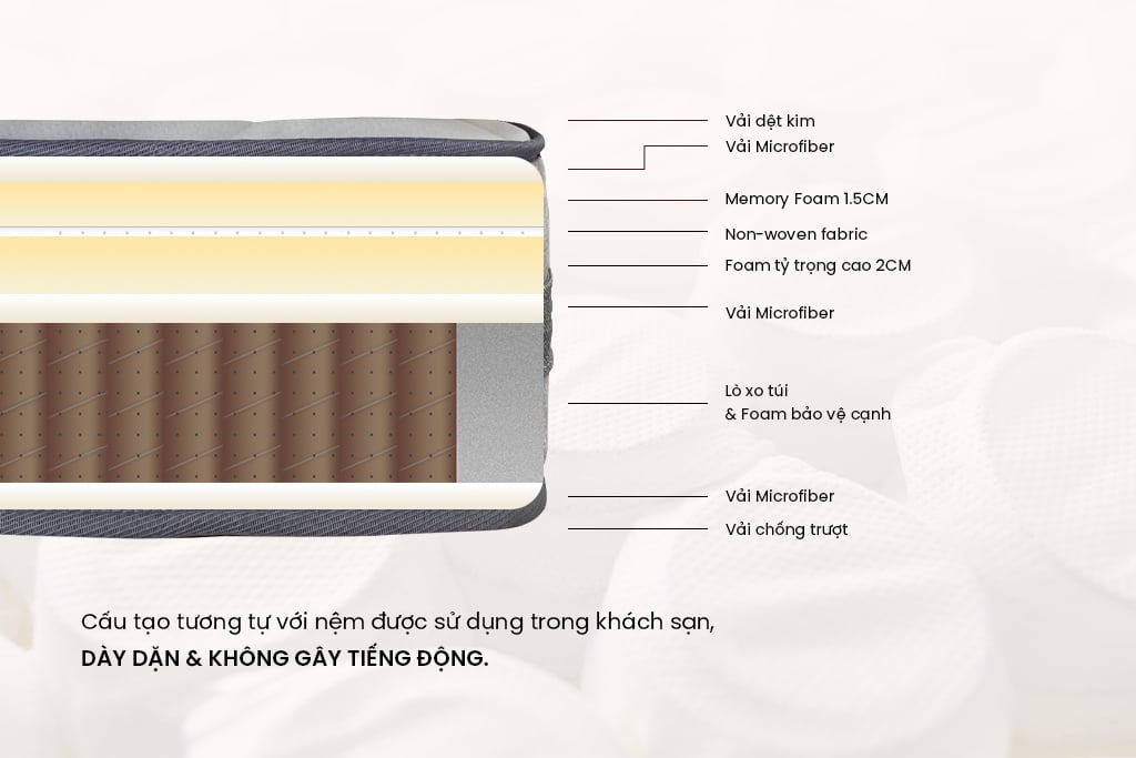 Hệ thống lò xo túi độc lập giúp giảm tối đa rung động khi có chuyển động, đặc biệt phù hợp với người ngủ nhẹ hoặc ngủ cùng người khác.