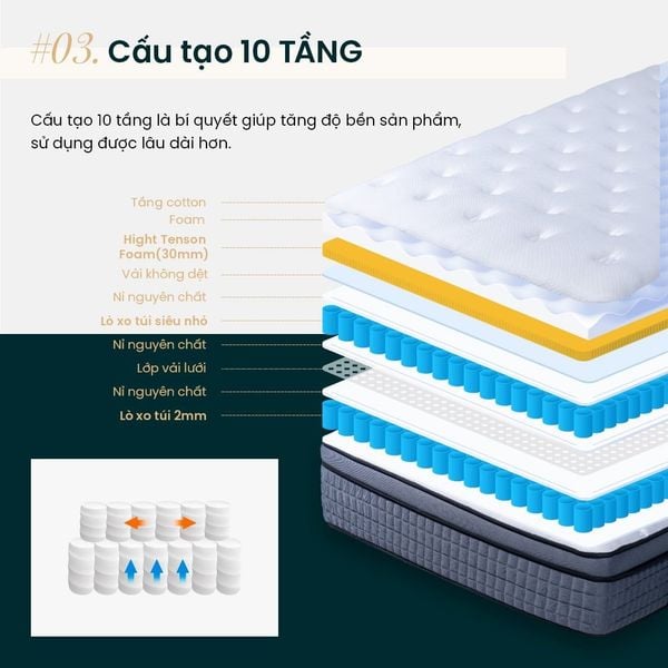 - Phía trên hệ thống lò xo là các lớp foam đàn hồi cao và High Tension Foam, giúp phân tán áp lực và tạo cảm giác êm ái khi nằm.
