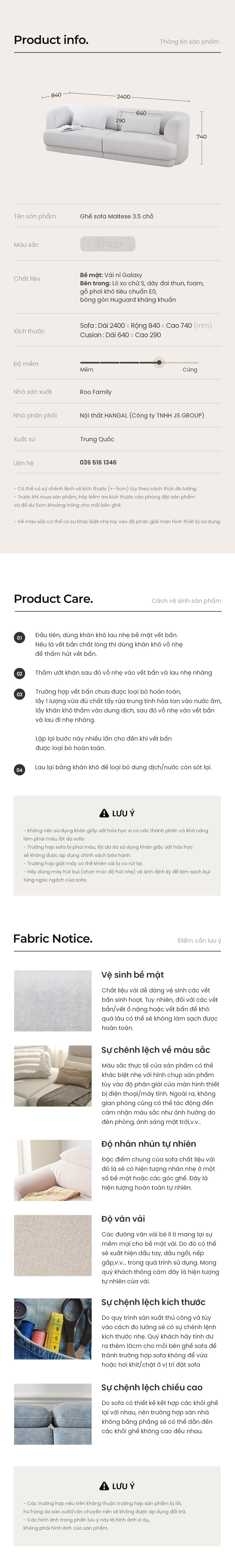 - Chất liệu: Vải nỉ Galaxy, lò xo chữ S, dây đai thun, foam, gỗ tiêu chuẩn E0, bông gòn Huguard kháng khuẩn